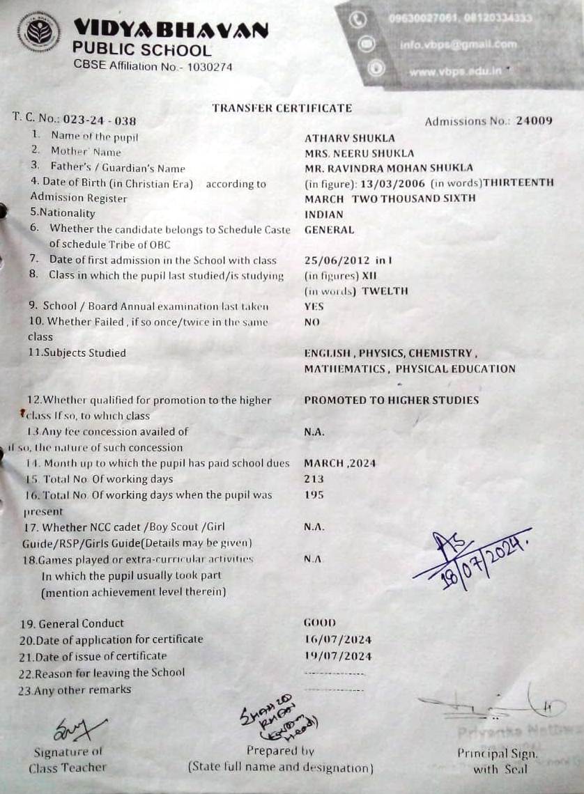 | 36 | 16.07.24 | 202324-038 | ATHARVA SHUKLA | XII PASS | Download |